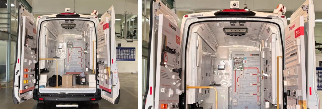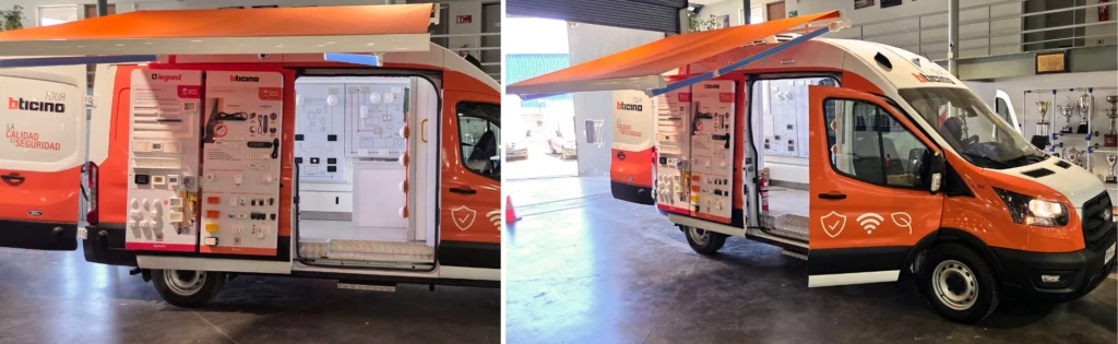 El interior fue configurado para exhibir correctamente los productos, contextualizar su uso, almacenar material gráfico y herramientas de apoyo, además de contar con alimentación eléctrica externa 220 V, conectividad a internet móvil mediante Starlink y generador eléctrico de respaldo. Todos los elementos del showroom utilizan, de manera prioritaria, componentes y equipamiento de marca Legrand o Bticino, reforzando la identidad del proyecto.