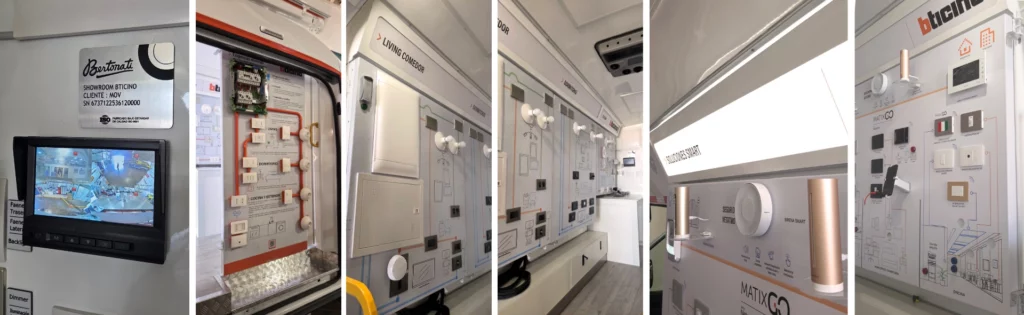 El vehículo fue diseñado como un showroom itinerante, permitiendo una experiencia directa y cercana con los productos Bticino. En su interior se exhiben distintas categorías clave del portafolio residencial, incluyendo tableros y equipamiento eléctrico, series de instalación como interruptores y enchufes, productos complementarios y soluciones avanzadas de citofonía y control smart.