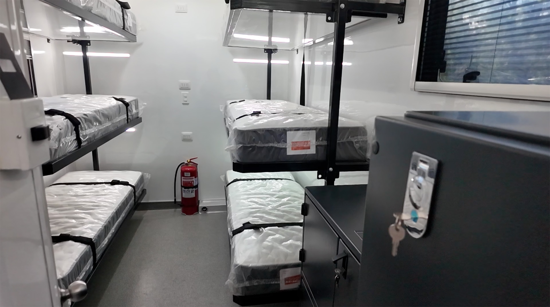 Camas, cocina, baño completo, mobiliario metálico anticorrosivo.