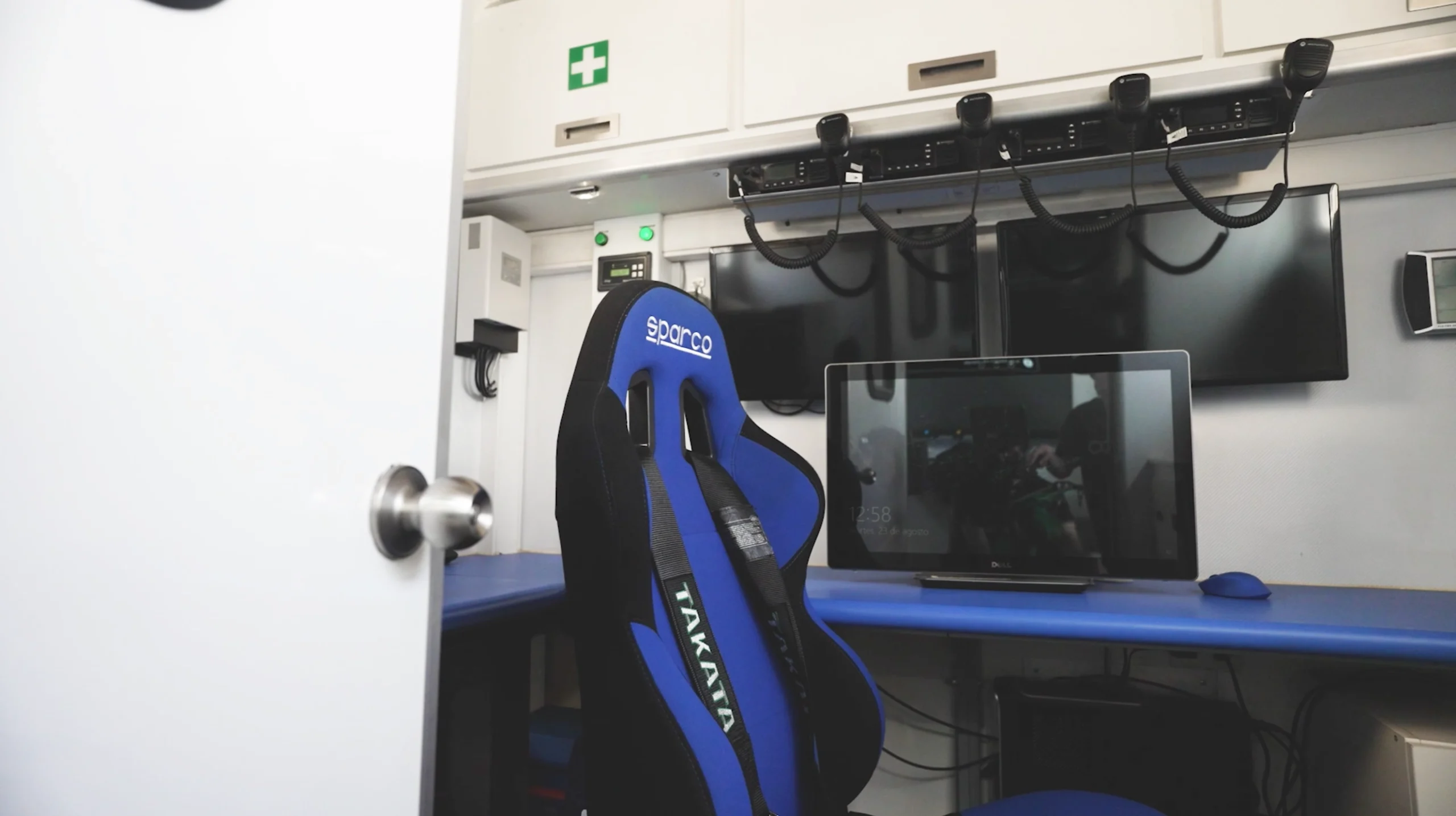 Interior operativo con sala de radio y planificación, mobiliario técnico y equipamiento audiovisual.